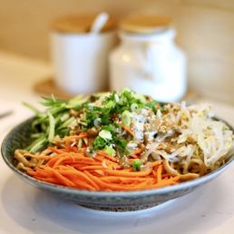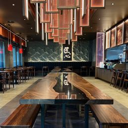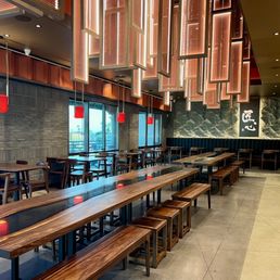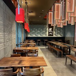 10/10: will be back,had an amazing meal and our service was friendly and quick. Joined the Yelp waitlist and was seated almost immediately after checking in. The soup here is the best I've had in a lot time. I got the spicy pork belly with hand pulled noodles. The broth was the perfect amount of spice to not take over the flavor and the pork belly had great flavor. 10/10 might be my new noodle soup spot! The appetizers were both good. The cucumber salad was crisp and the peanut sauce was light and flavorful. The pot stickers took a bit longer to make, and I thought the dough was a bit thick, but my friend really liked them. They have some individual tables and a couple of community tables but it wasn't super crowded, so the spacing wasn't bad.